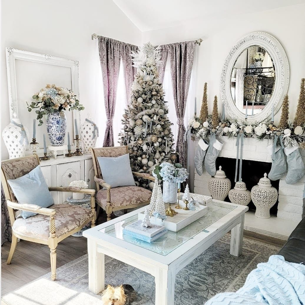 The room is bathed in a soft glow from the white coffee table and delicate pastel accents. A collection of gentle trees and flowers graces the surface, creating a refined winter wonderland. This decor whispers of a dreamy, white Christmas with its gentle, elegant palette.