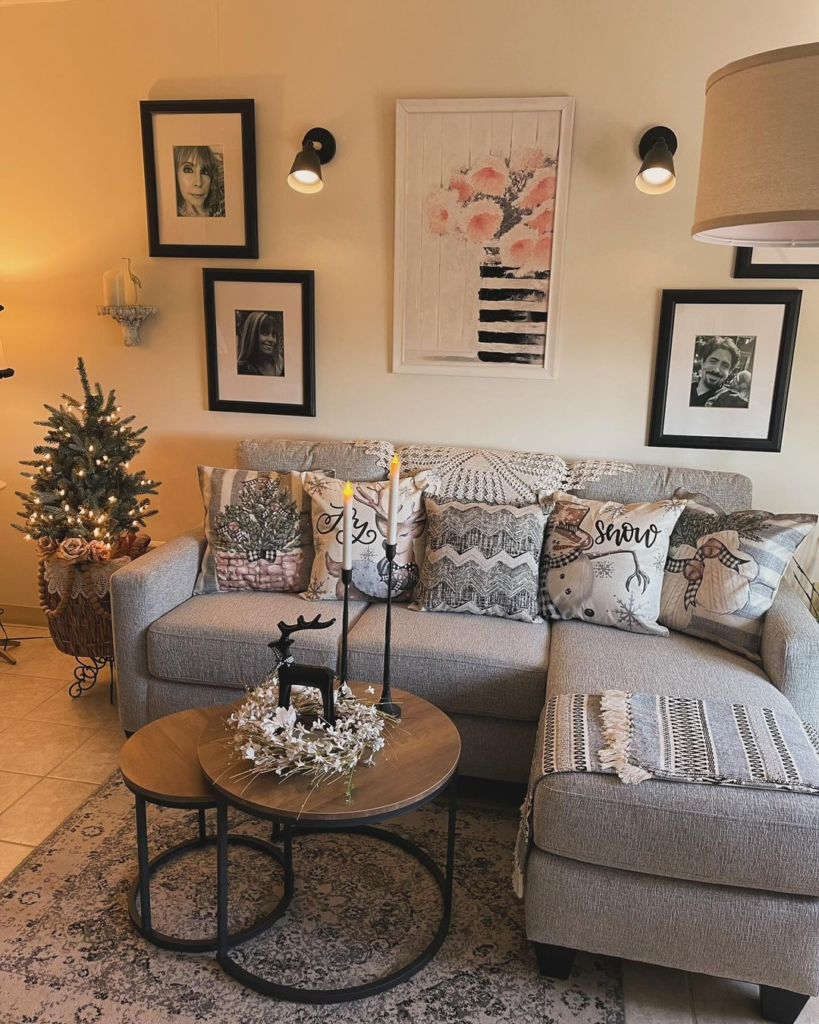 The marble coffee table is adorned with a petite, twinkling Christmas tree, setting a joyful tone. A candle and festive holiday accents are casually placed, adding a personal touch. This playful, eclectic decor complements the gallery wall, showcasing a unique approach to Christmas cheer.