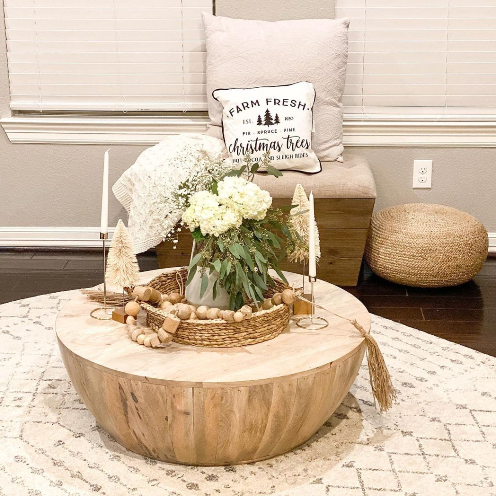 A round coffee table presents a clean and elegant Christmas arrangement with a wooden bowl, a touch of greenery, and stacked books. This minimalist approach highlights a modern holiday aesthetic, showcasing sleek and stylish holiday decor.