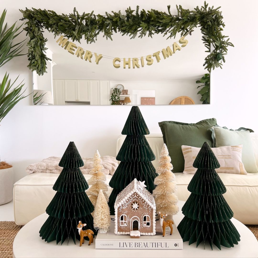 A modern coffee table features an array of paper Christmas trees and a gingerbread house, creating a minimalist festive village. A ‘MERRY CHRISTMAS’ garland frames the scene, offering a stylish and contemporary interpretation of holiday traditions.