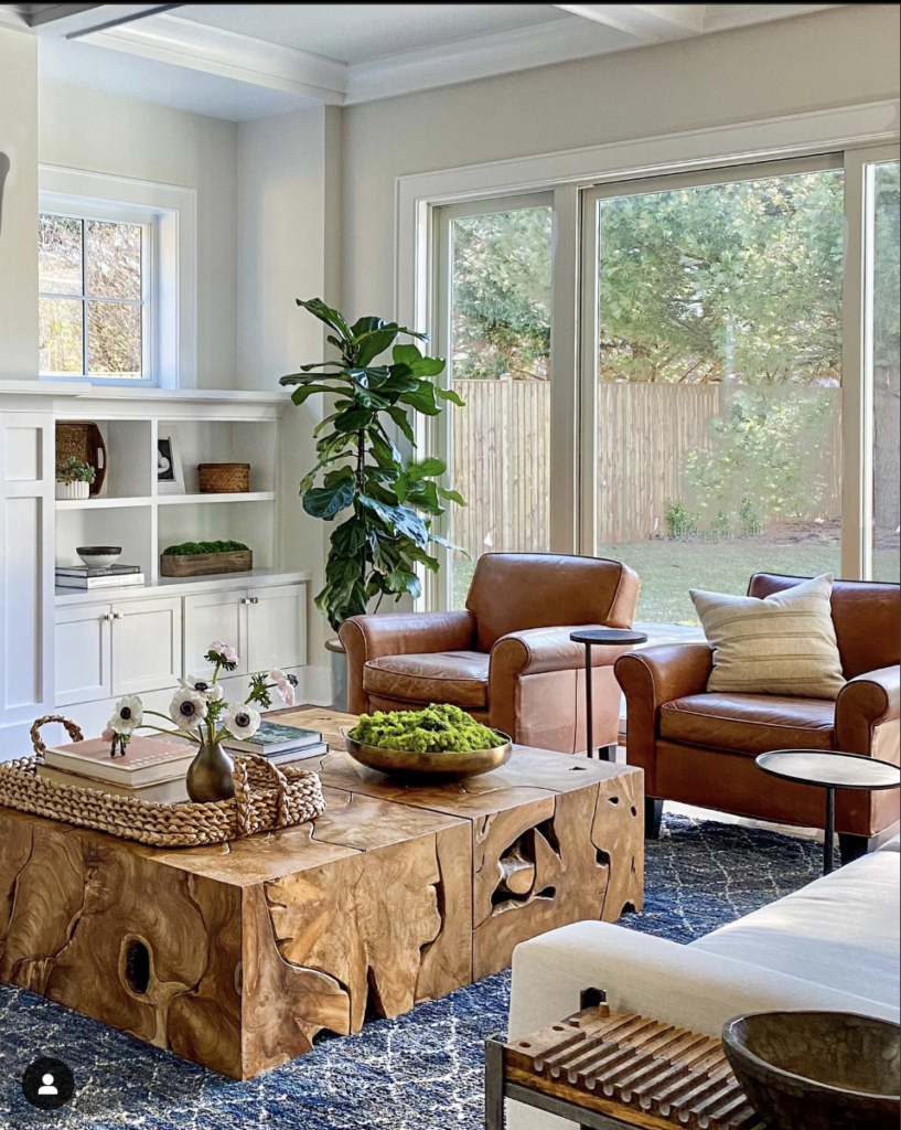 Natural solid wood tables complement the rich tones of brown leather sofas beautifully. The warmth and texture of the wood enhance the cozy, inviting atmosphere of your living room, creating a harmonious and comfortable setting.