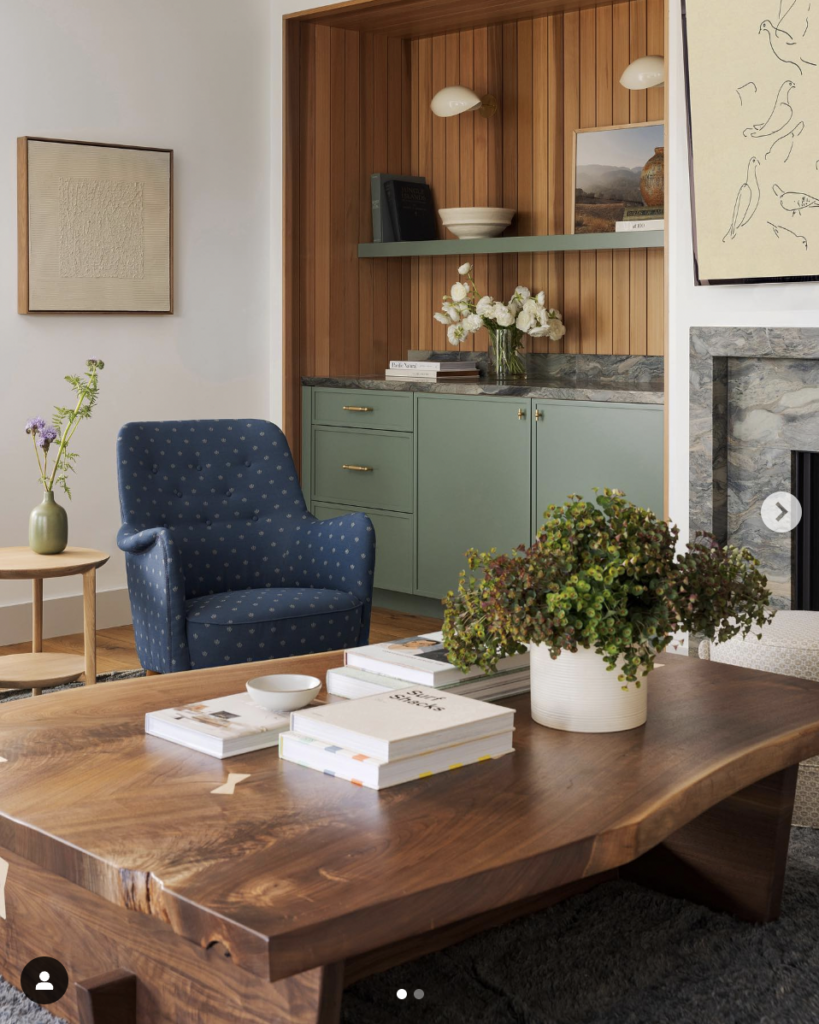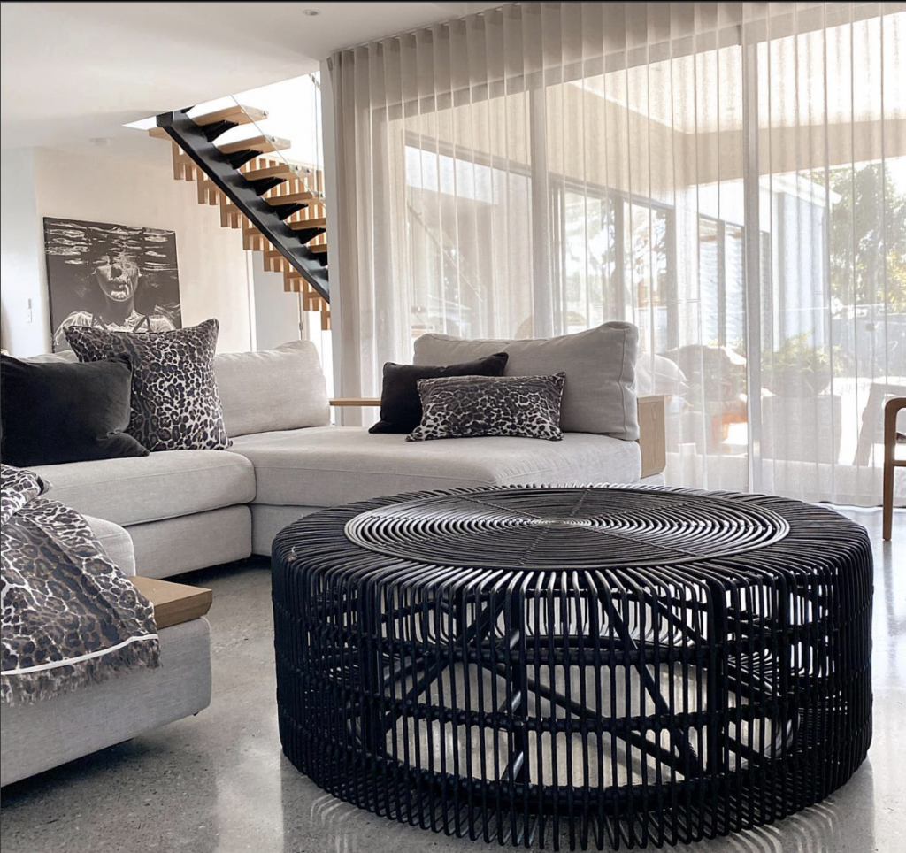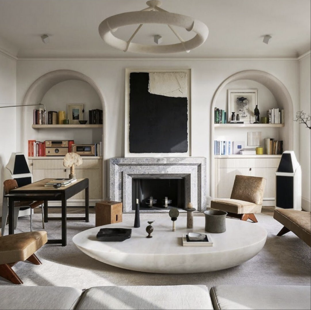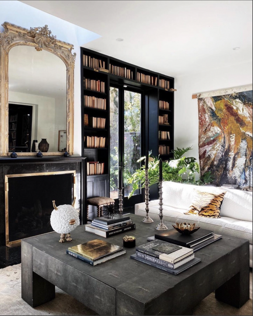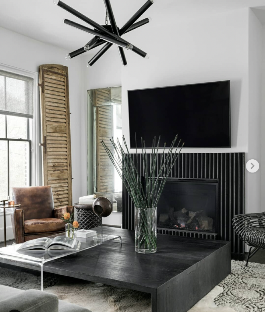 The combination of a striped black fireplace with an oversized black center table offers versatility in design. This pairing adapts well to various styles, from modern to eclectic, and complements both monochromatic and colorful interiors.