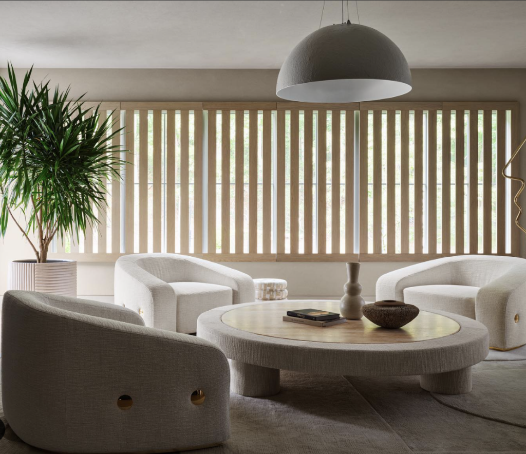 In open-concept spaces, a large wood grain coffee table helps define different areas. Its substantial size and texture add visual interest and a sense of organization, breaking up expansive areas and creating intimate, well-defined zones.