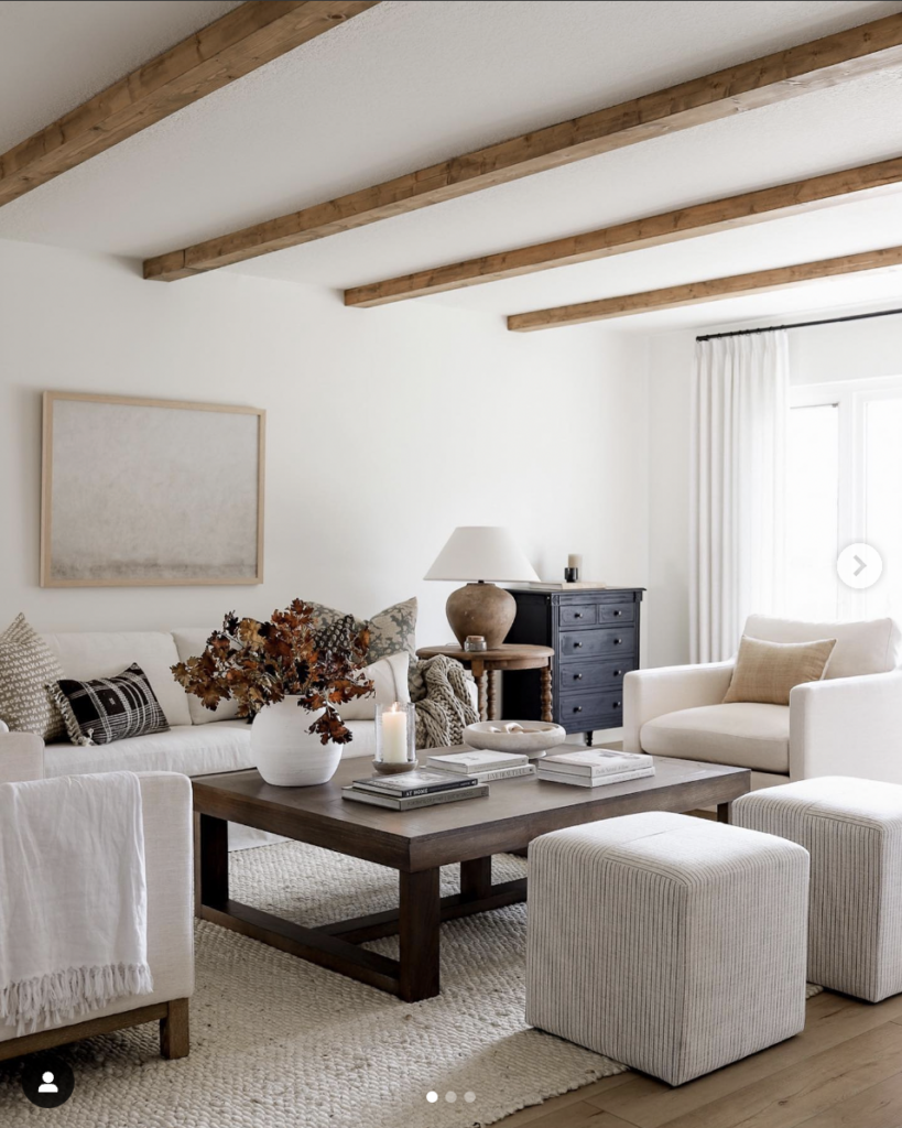 Oversized natural wood coffee tables serve as central gathering spots in farmhouse living rooms. Their large surface area invites conversation and connection, enhancing the room’s welcoming and social atmosphere.