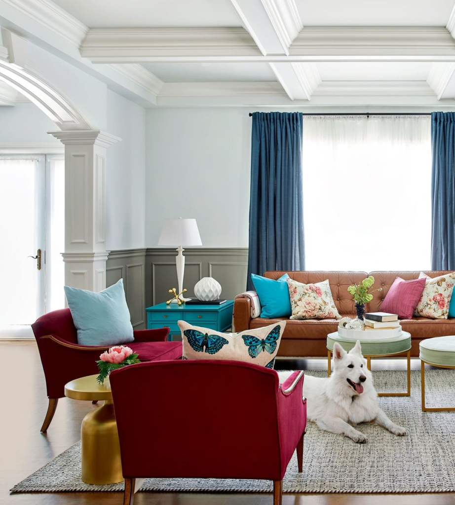 This living room blends lively and sophisticated elements with a playful mix of pastel walls and bold furniture. The striking maroon armchairs are vibrant focal points, beautifully offset by a warm brown leather sofa. Adding a touch of organic charm, a spirited white dog completes the room’s cheerful and dynamic atmosphere.