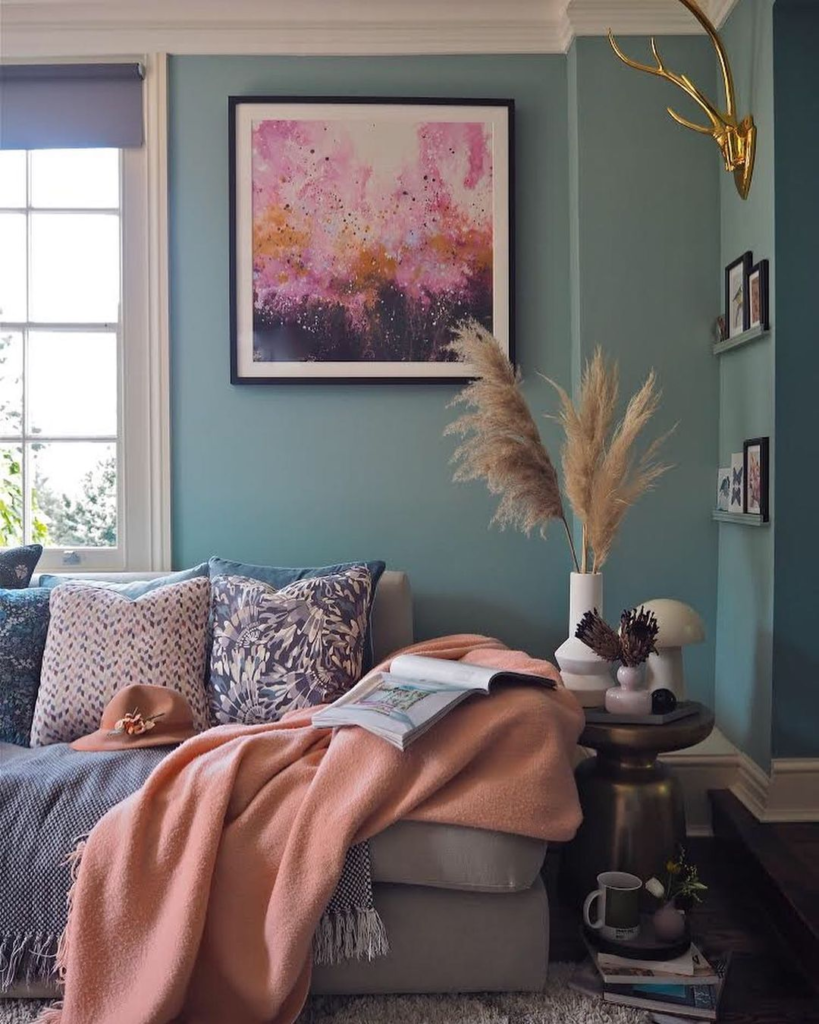 In this bohemian-inspired living space, comfort and color merge seamlessly. Soft teal walls set a tranquil backdrop for vibrant cushions and cozy throws. A standout abstract painting in shades of pink and gold infuses energy, while pampas grass and a golden deer head accessory add a chic bohemian touch.