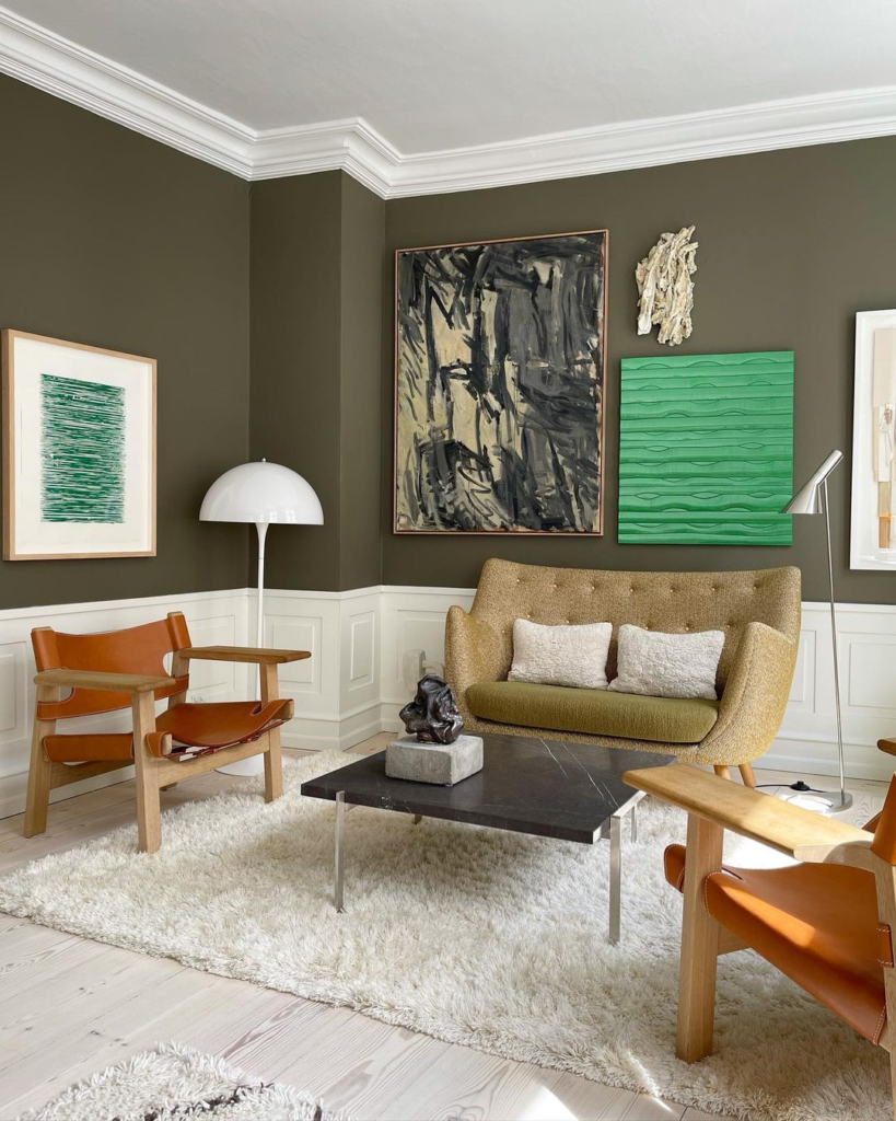 In this living room, a dark green color palette contrasts sharply with white paneling and abstract art, creating a vibrant yet refined space. Clean lines and a minimalist aesthetic emphasize modernity, while plush textures ensure the room remains welcoming and lively.