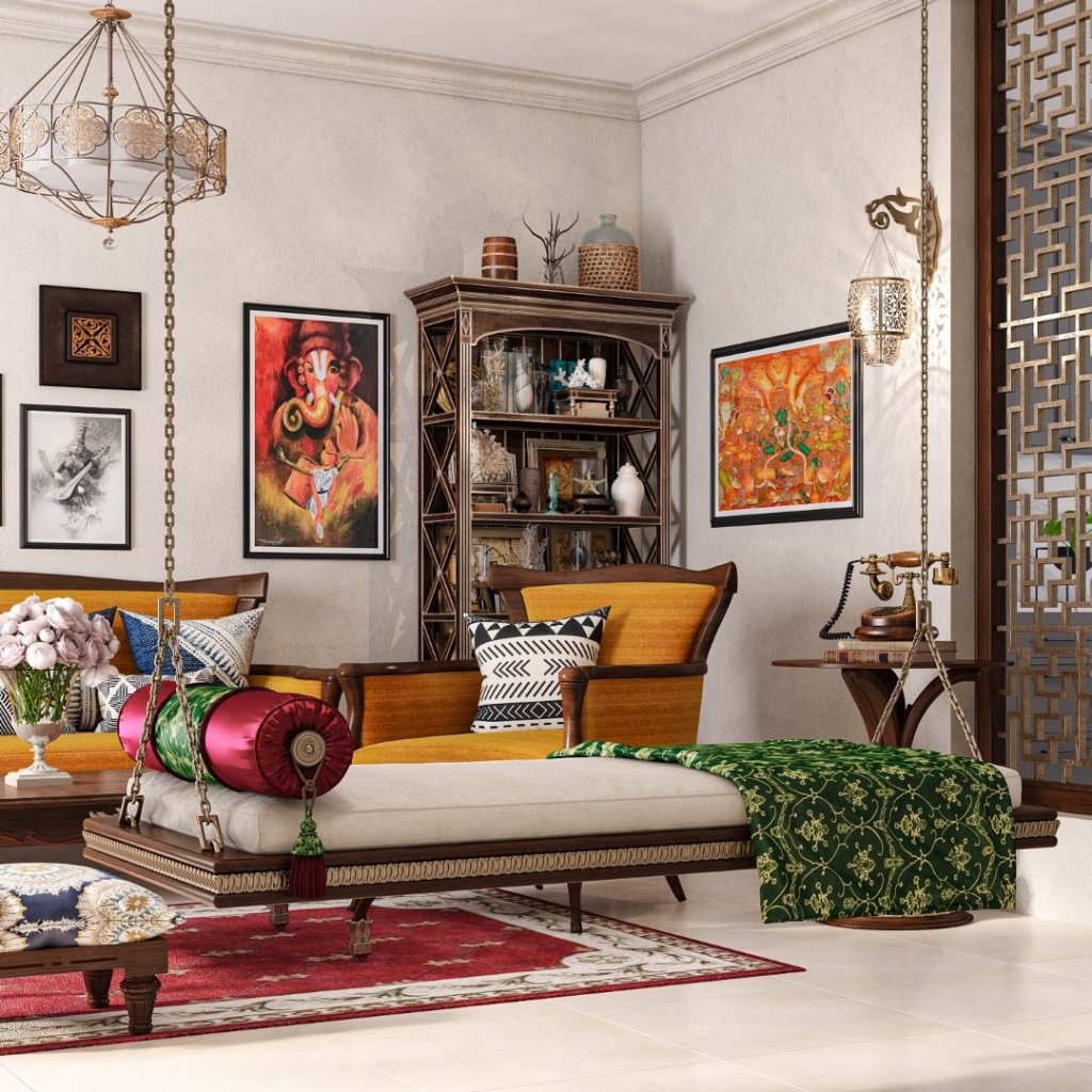 This vibrant space showcases a fusion of global influences with its mix of patterns and textures. Bold colors on furniture and curtains evoke a sense of worldly charm, while the eclectic mix of fabrics creates a room that is both vibrant and grounded, inviting conversation and cultural exchange.