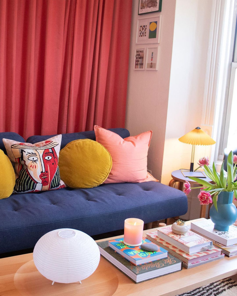 Robust red curtains frame this vibrant room like a stage, complementing the mustard and navy sofa. An eclectic pillow adds avant-garde flair, while a pleated lampshade casts a warm, inviting glow, perfect for cozy reading sessions.