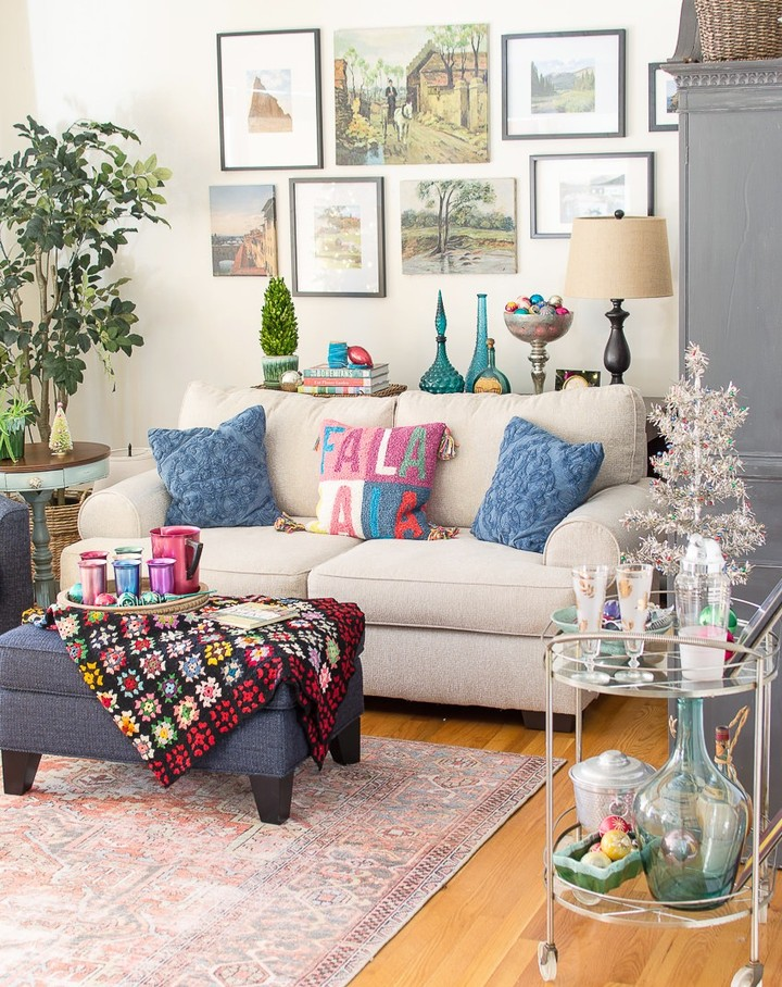 Among a gallery of pastoral scenes, this living room corner bursts with vibrant colors and eras. A granny square throw adds a handcrafted touch to the ottoman, while eclectic glassware and textiles whisper tales of past travels and times.