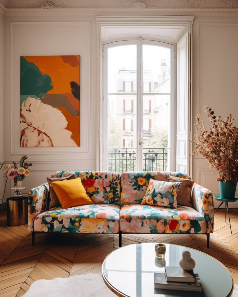 A bold floral couch blooms against the herringbone floors of a Parisian apartment, complemented by a large abstract painting. Yellow and pink splashes in the decor enhance the natural light, creating a space that is both vibrant and soothing.