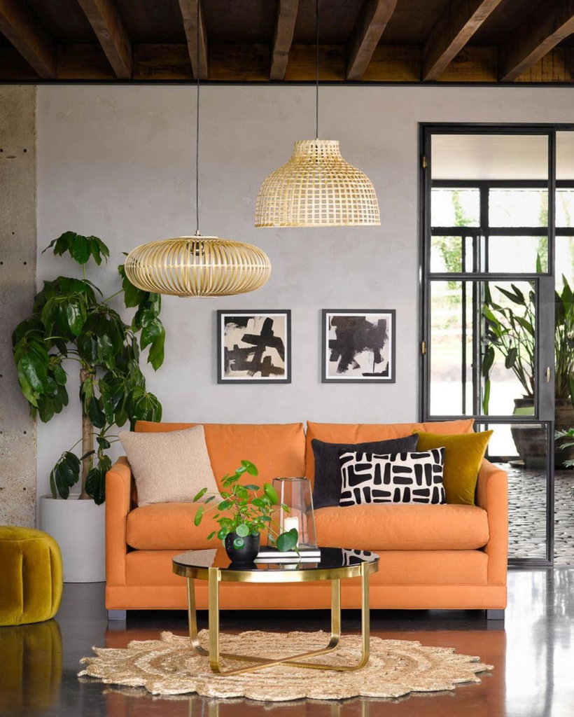 This airy room combines modern lines with rustic charm, anchored by an earthy orange sofa. A contemporary art piece and chic pendant lighting create a balanced fusion of sleek and natural elements, resulting in a vibrant yet grounded atmosphere.