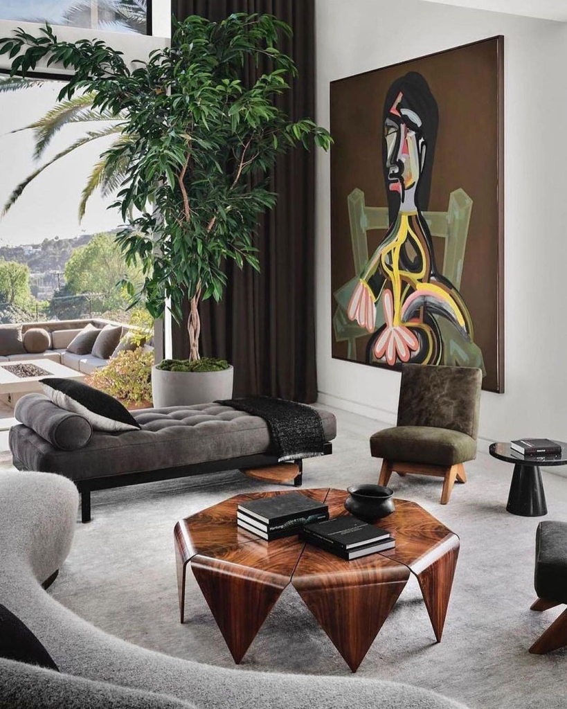 Modern art and greenery stand out against a minimalist backdrop, creating a vibrant yet balanced space. The understated elegance of the furniture allows bold art and lush plants to make a statement, embodying a chic, lively urban oasis.