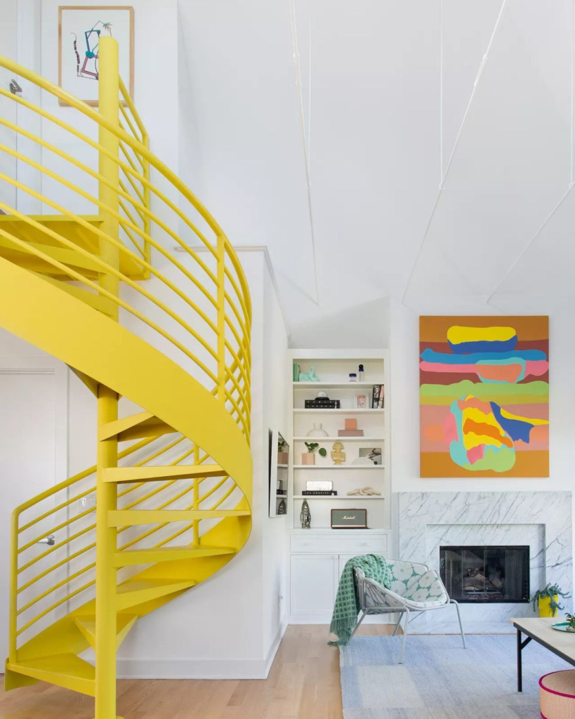 A yellow spiral staircase injects fun and movement into the living space, while cool-toned art and furnishings provide a composed yet vibrant environment. It’s an ideal setting for both creative inspiration and peaceful retreat.