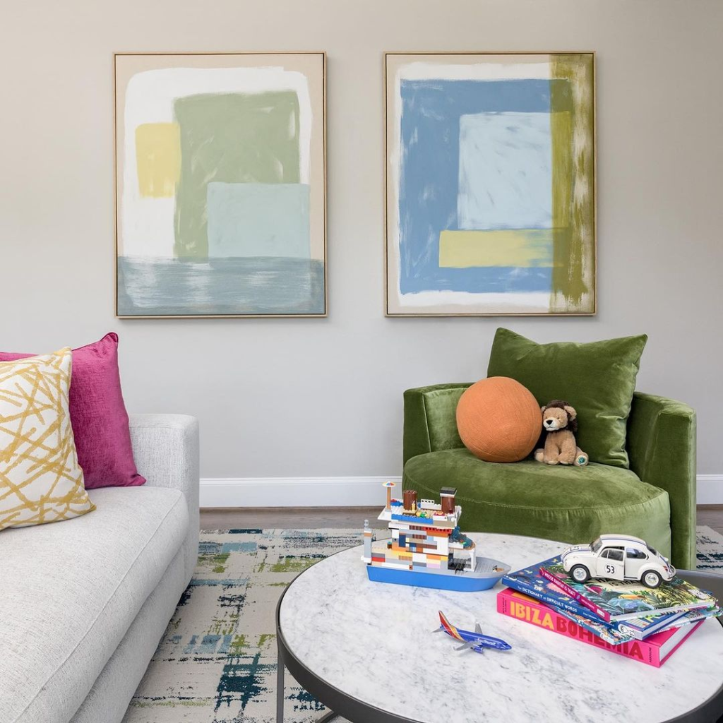 This room blends playful sophistication with abstract wall art and a lush green armchair. The vibrant, yet subtle accents invite calm creativity and a splash of youthful energy, creating a space that balances fun and tranquility.