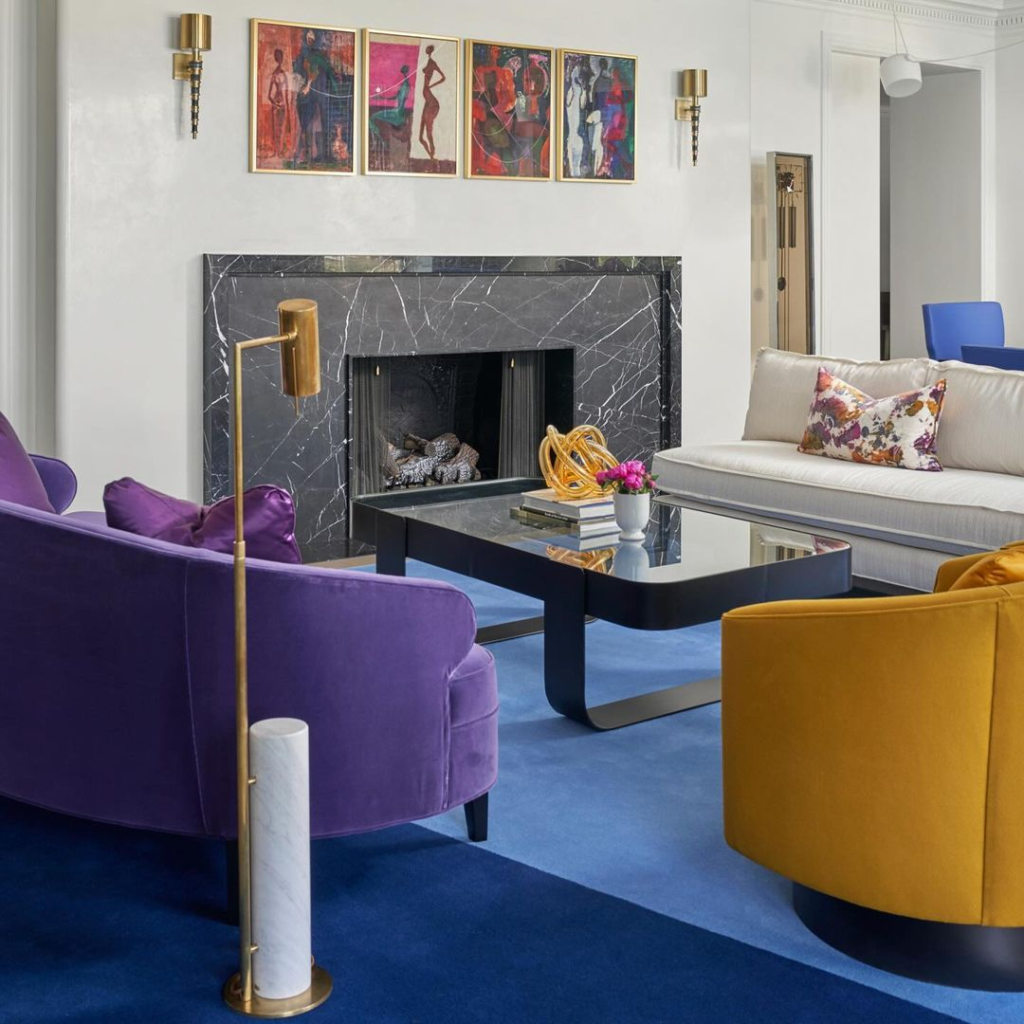 Royal purple chairs and a vibrant blue rug command attention, complemented by neutral walls and a marble fireplace. An art collection adds sophistication, making the space both regal and inviting.