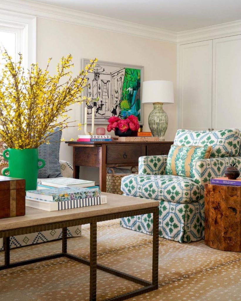 This room delights with whimsical botanical prints and a burst of forsythia yellow. A large-scale art piece adds a contemporary edge, while vintage wood textures provide warmth, creating a space full of charm and vibrancy.