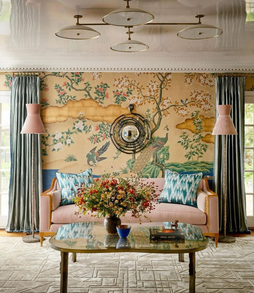 An enchanting wall mural sets a pastoral scene in this elegant living room, bringing storybook vibrance. The blush-toned sofa and verdant drapery frame the space in soft, romantic hues, while ornate lighting fixtures add a touch of luxury.