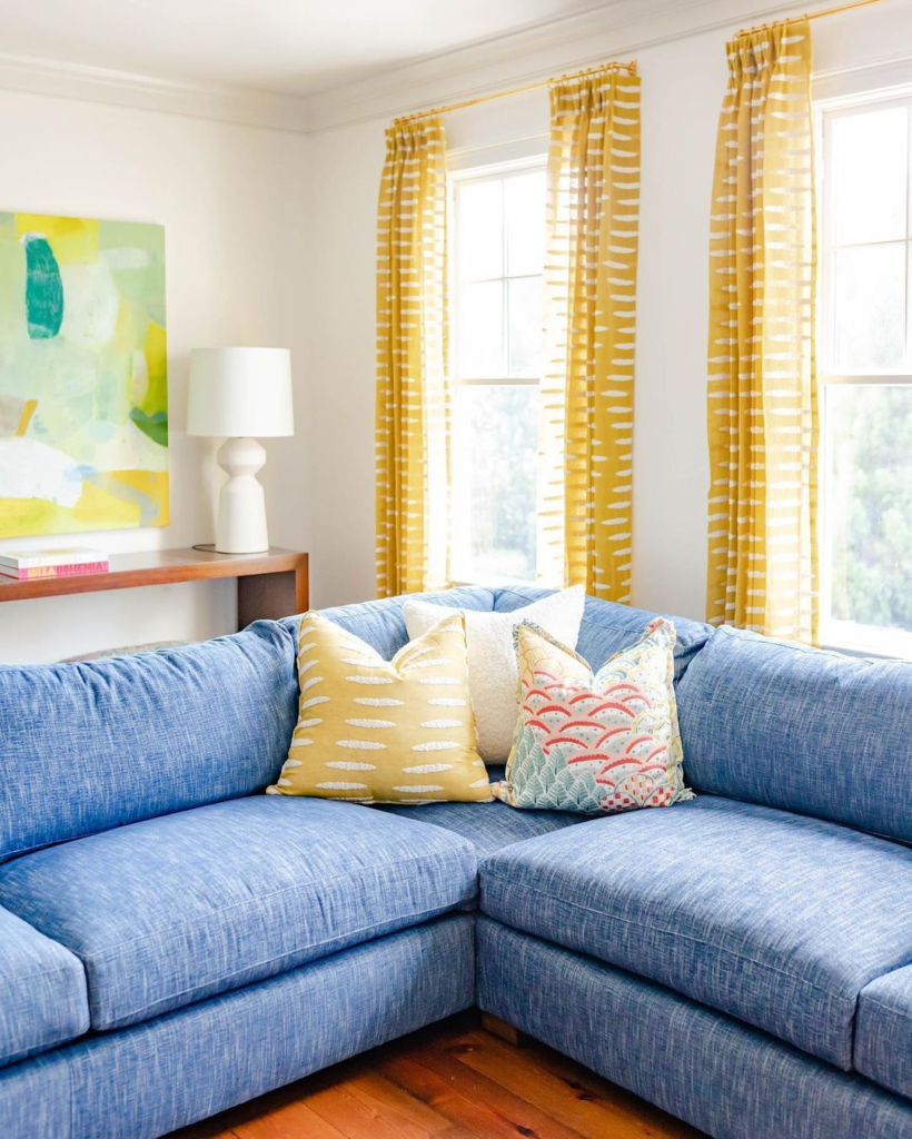 Crisp denim blue upholstery pairs with sunny yellow curtains to create a cheerful, inviting nook. Artwork that echoes the curtain’s color scheme ties the space together, epitomizing casual vibrance.