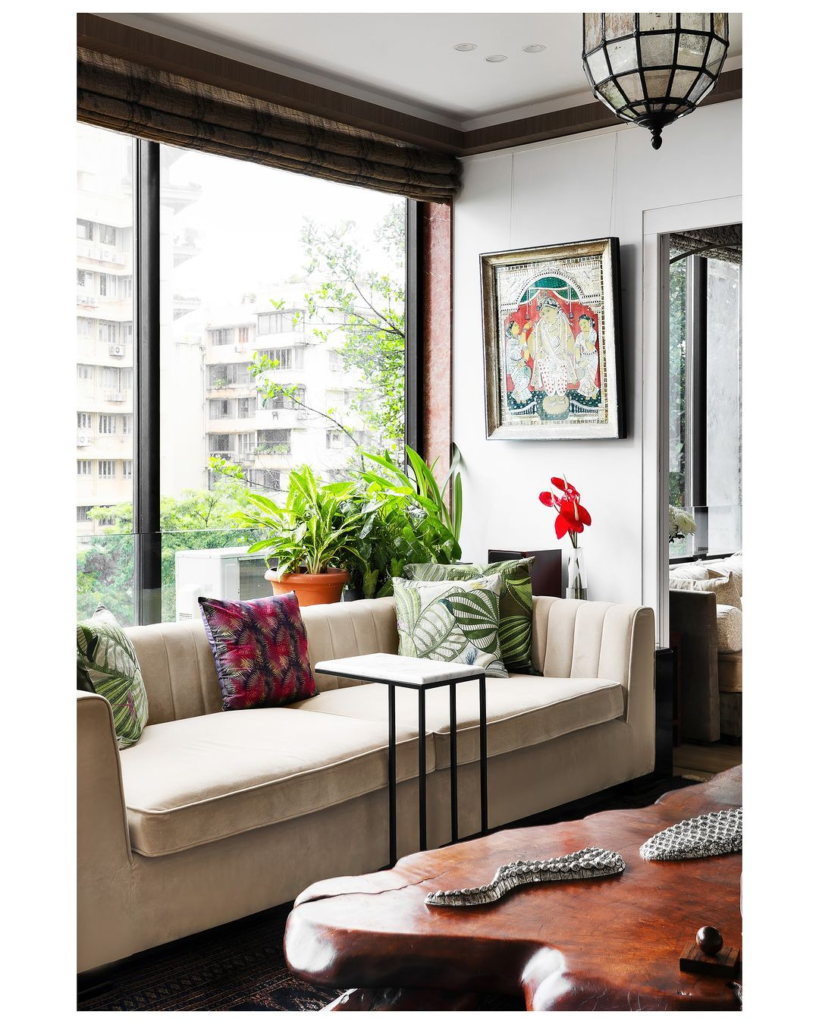 This room combines modern aesthetics with lush indoor greenery, creating a vibrant urban retreat. Ethnic art and plush textures add worldly charm, while large windows invite natural light into the space.