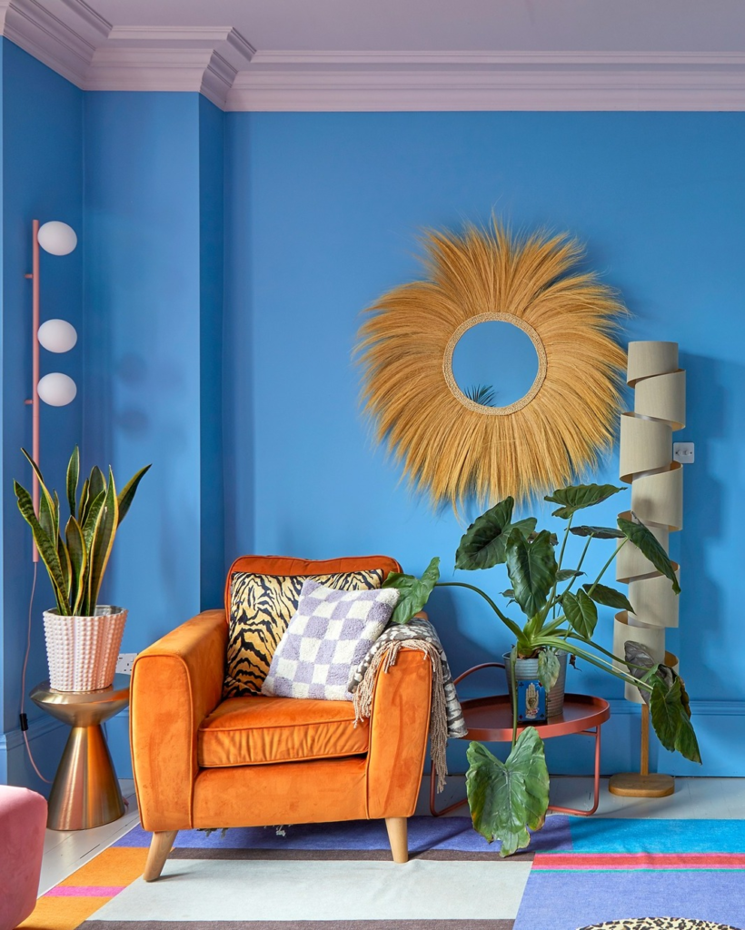 Bold blue walls provide the backdrop for a sunburst mirror’s radiant glow in this retro-inspired space. The earthy orange chair and patterned rug offer a nostalgic touch, while the sleek side table introduces modernity.