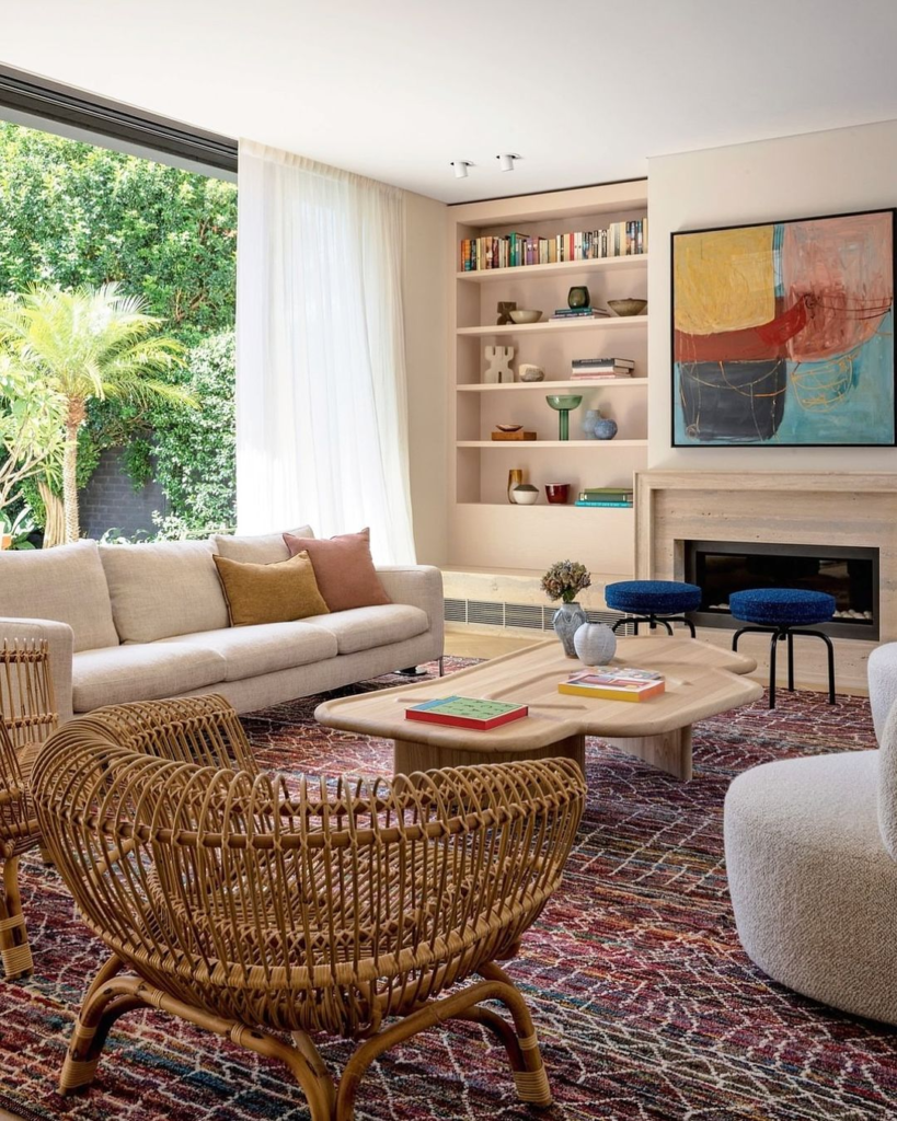 Bohemian warmth emanates from woven textures and rich colors in this inviting space. A harmonious blend of wood and rattan furniture against a vibrant rug creates a lived-in, vibrant atmosphere.