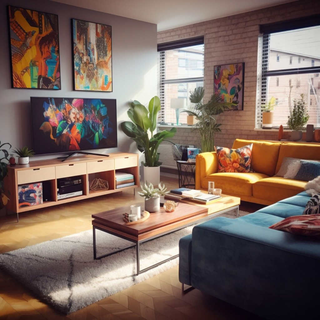 In this “Eclectic Sunshine” living room, a bold yellow sofa energizes the space, complemented by mid-century flair and modern art. Verdant plants add freshness, while cool blue secondary seating offers a calming contrast, making the room a balanced hub for relaxation and entertainment.