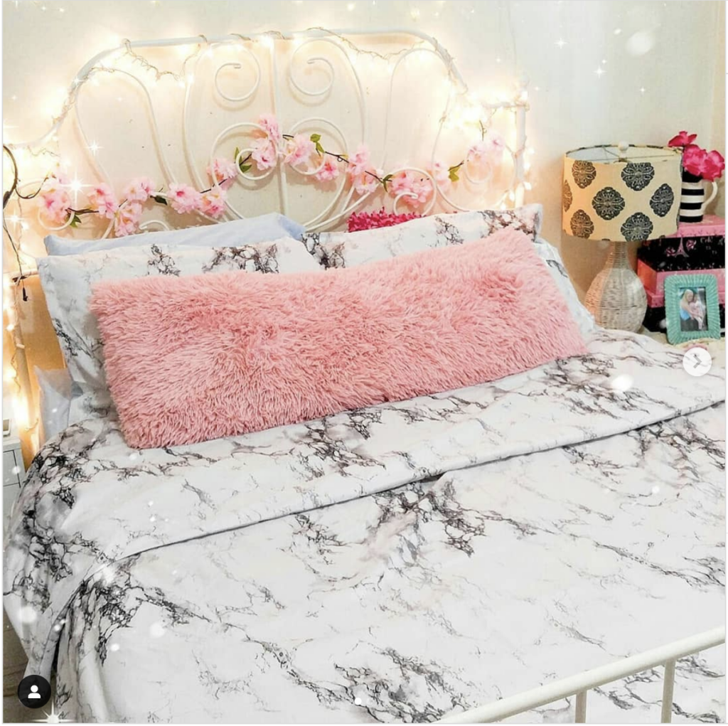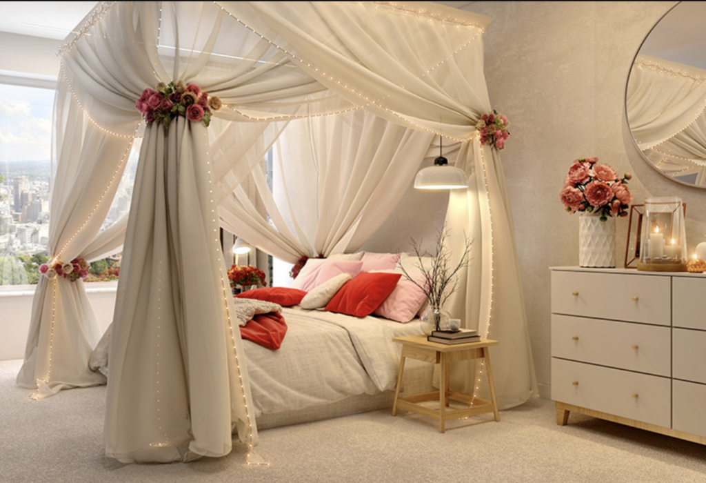 Pink plush pillows are synonymous with comfort and romance. Their soft, inviting color, combined with flower garlands, sets a loving and enchanting tone for your bedroom. These elements contribute to a cozy and romantic atmosphere, perfect for relaxation and intimacy.