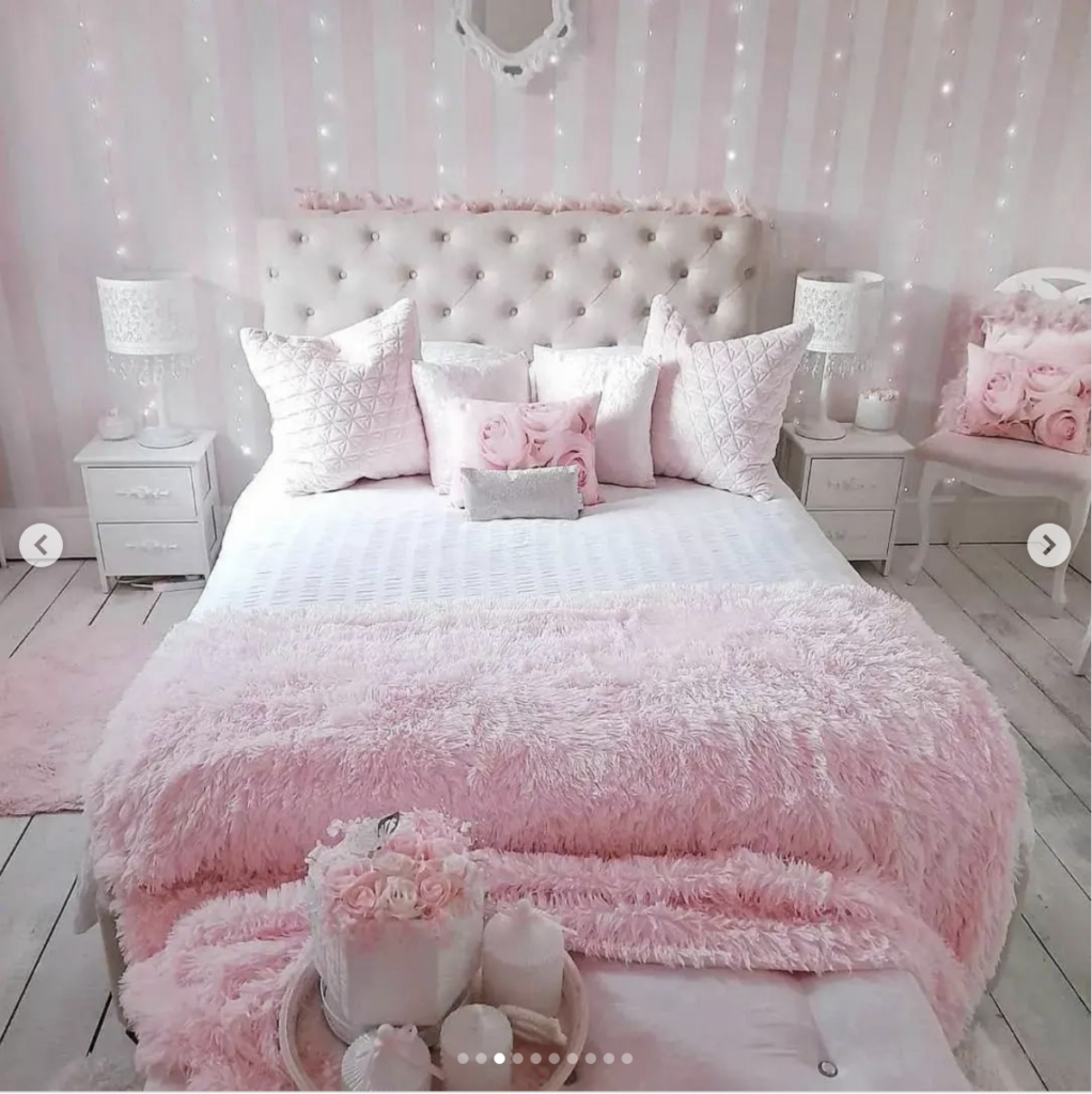 A white and pink bed serves as a romantic centerpiece in your bedroom. The combination of soft white and delicate pink evokes feelings of love and tranquility. Placing matching bedside tables on either side complements the romantic theme and adds balance and functionality to the space.