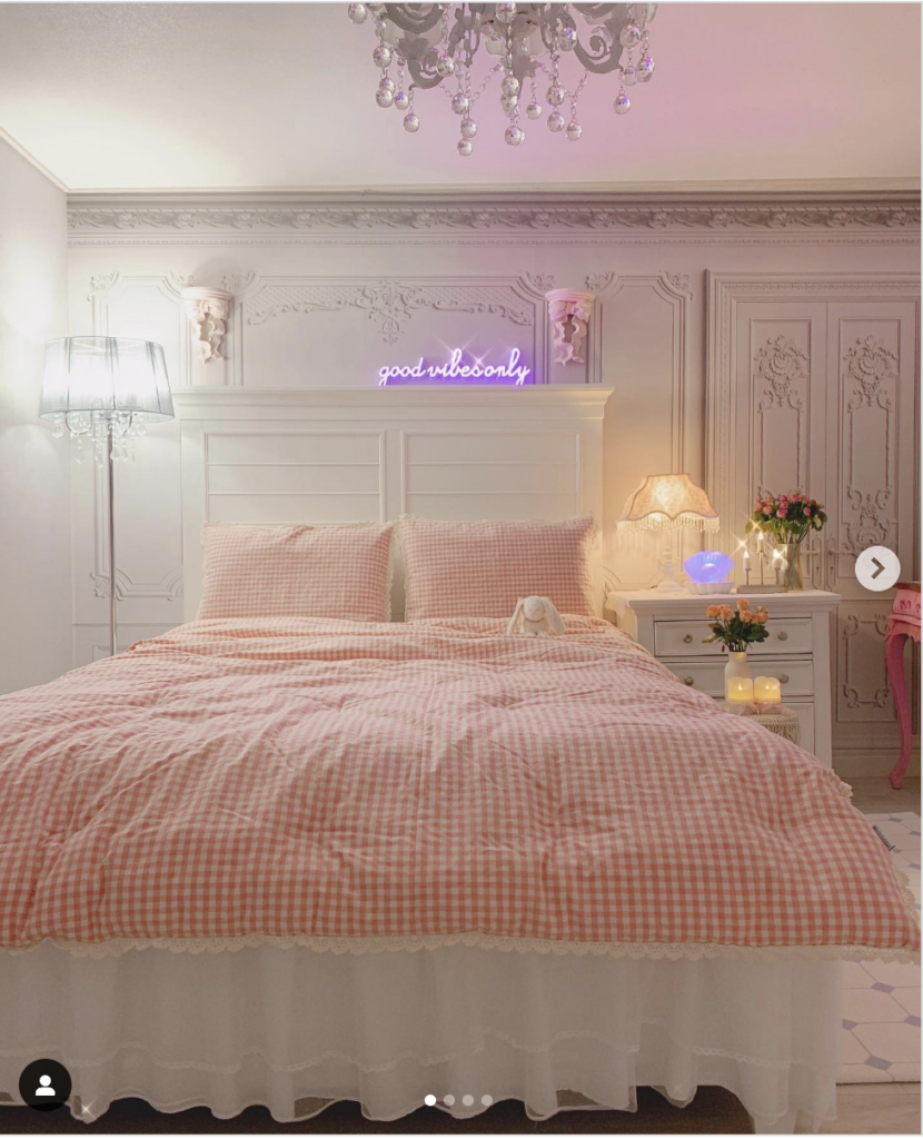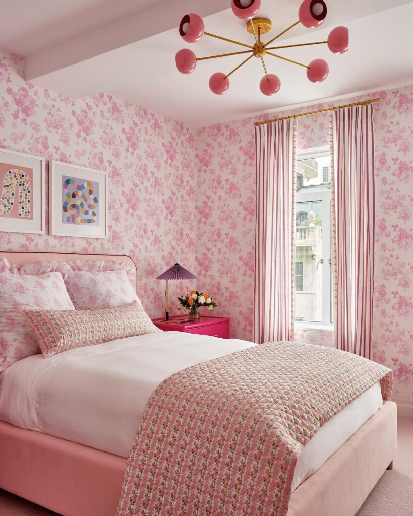 Elevate your pink bedroom with the addition of an LED curtain and a chandelier. The LED curtain adds a magical, twinkling effect, while the chandelier provides a touch of elegance. Together, they enhance the room’s romantic and whimsical atmosphere, creating a captivating and stylish space.