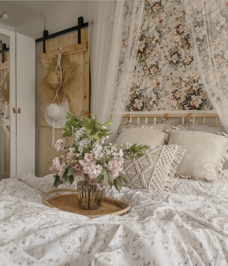 Floral wallpaper brings a touch of romance and charm to the bedroom. Whether you choose soft or bold patterns, it creates a beautiful backdrop for your bed. Pairing floral wallpaper with a barn door adds rustic elegance and enhances the overall romantic atmosphere.
