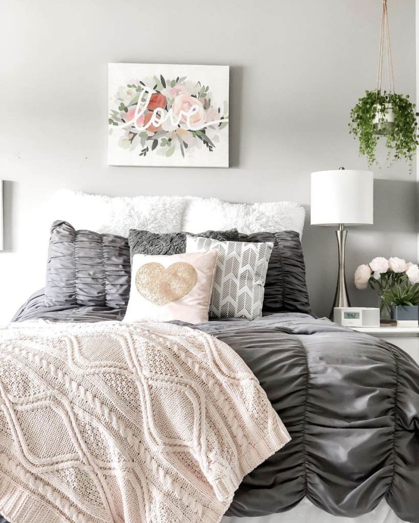 Combining white, pink, and grey bedding creates a balanced and sophisticated look. Grey adds depth and elegance, complementing the softness of white and the warmth of pink. This color combination provides a harmonious and refined atmosphere, perfect for a romantic bedroom retreat.