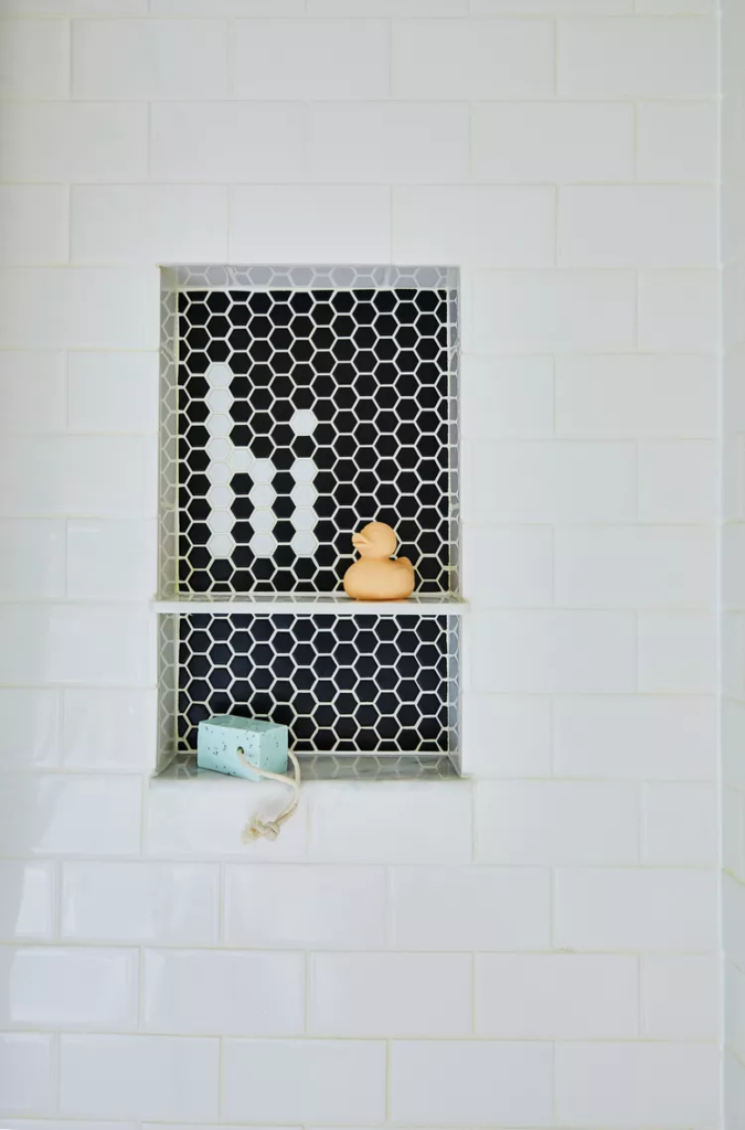 Penny tile allows you to create patterns of any kind—even letters and words. Whether it’s on the floor or in a shower niche, the options are endless. Using contrasting colors like black and white allows the letters to stand out.