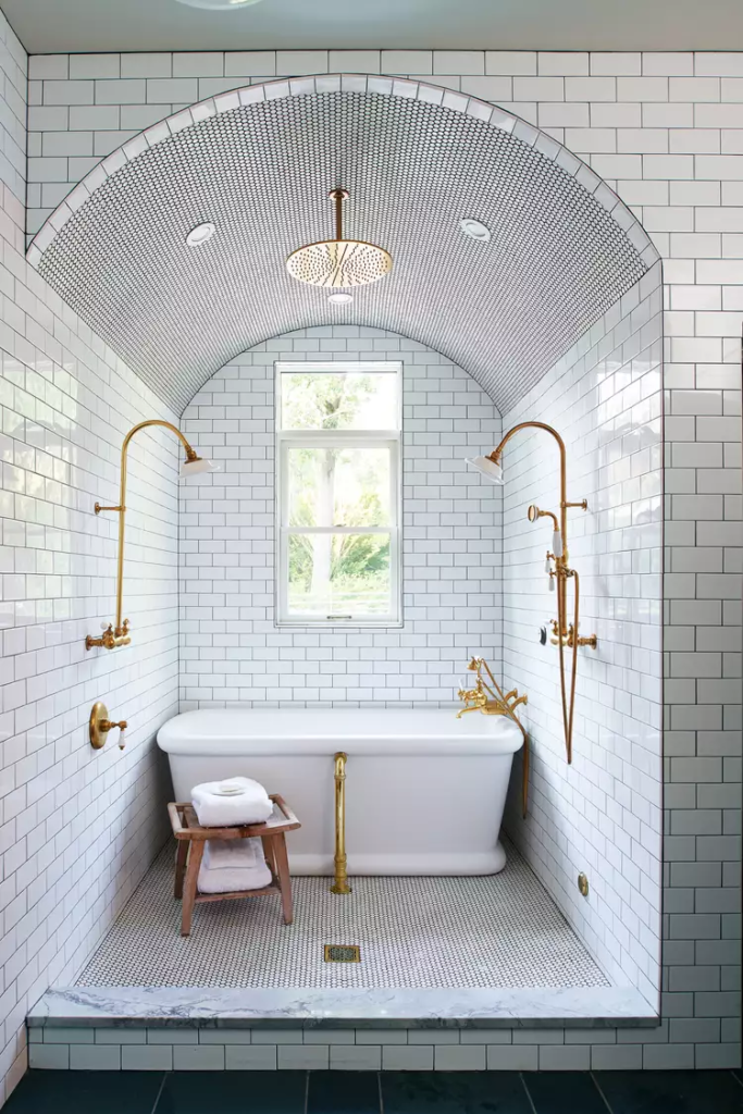 If you have the space for it, an arched shower ceiling makes for a dreamy bathroom experience. Go for a color similar to the walls and overall bathroom color scheme for a light and airy look, or pick something completely different for a bold, eye-catching ceiling. Small tile, like penny tile, works best for the curve of the arch.
