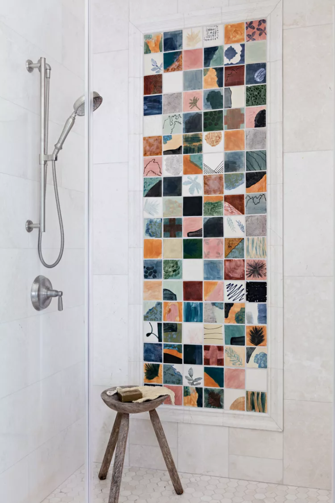 Your entire shower doesn’t have to be solid with color or pattern to be bold—just a small variation can make a big impact. Funky colorful tiles dress up this plain white bathroom, Try mixing tiles that have abstract patterns with solid colors, all in the same shape and size, to create a mosaic effect.