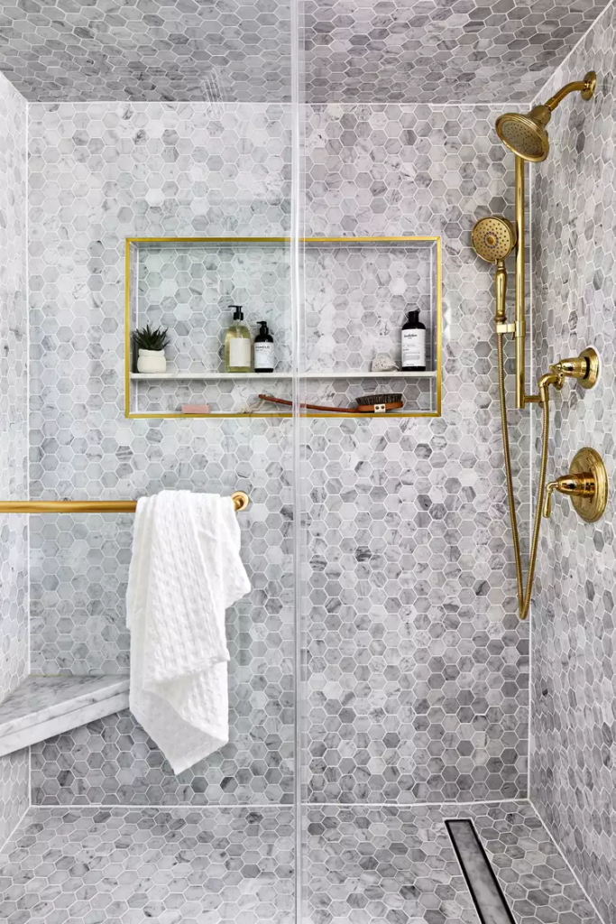 Hexagon-shaped marble tile on the walls, ceiling, and floor gives stylish detail to this walk-in shower. The detailed repetition and all-over use makes for a uniform look, but the natural variation in the tile’s color provides just enough color contrast to keep it interesting. A brass wall-mounted showerhead and decorative gold trim around warm up the gray space. A glass door with a curved brass handle lets in plenty of natural light and keeps the shower wall tile on full display.