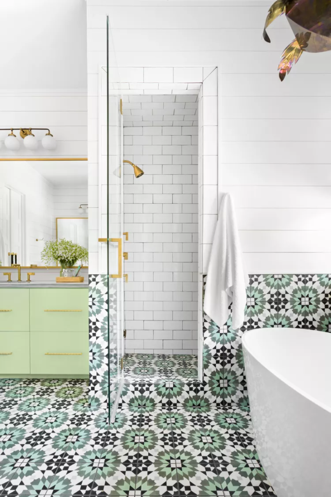 Let neutral shower walls create a calming space in an otherwise busy bathroom. Cement tiles featuring a bold green and black geometric pattern extend from the floor to the walls and into the walk-in shower in this gorgeous bathroom. A traditional white subway on the shower walls keeps the rest of the space simple and uncluttered, as do the white shiplap walls throughout the bathroom. Brass fixtures in the shower pop against the green, black, and white tile, and tie in the mint green vanity hardware, mirror, and light fixture for a cohesive bathroom design.