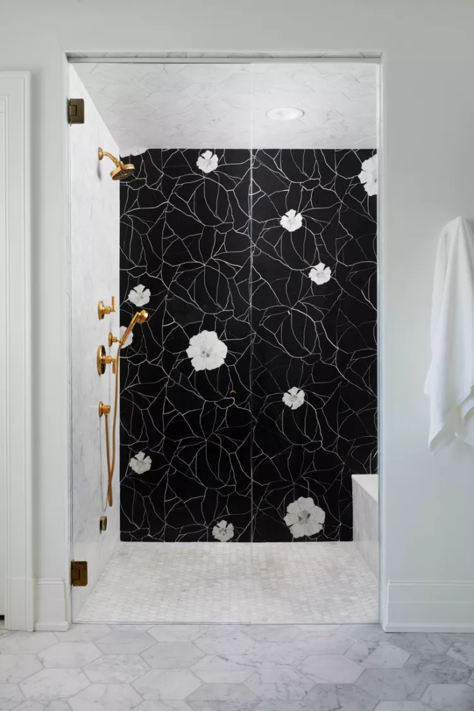 A striking black and white accent wall featuring a unique flower design adds monochromatic drama to this doorless shower. Detailed floral imagery in the wall tile extends from the floor to the ceiling and creates a mural-like effect. When using a statement tile such as this, keep the rest of the shower more muted for visual balance. White marble on the walls, ceiling, floor, and built-in bench brighten the space and warm-toned brass fixtures add a touch of luxurious elegance.
