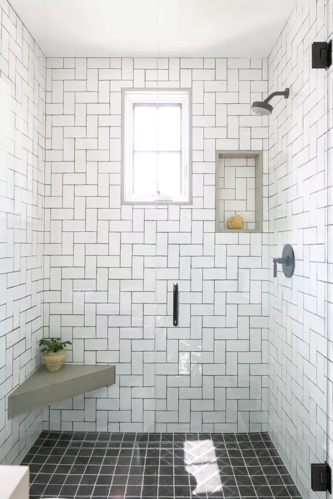 Gain inspiration from this modern bathroom and add visual interest to a monochrome color palette with an interesting tile arrangement. Here, white subway tile is arranged in a straight herringbone pattern for a linear look that’s highlighted with dark gray grout. The dark grout color ties together the black floor tiling that gets the reverse finishing touch with white grout forming a grid pattern. A triangular-shaped floating shelf brings in a new shape and color, and minimalist black fixtures keep the focus on the shower wall tile.