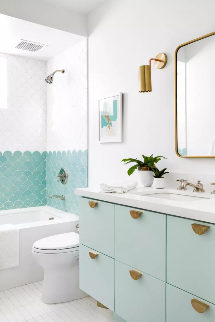 A scalloped tile design adds a playful coastal element to this small bathroom. A white, mint green, and brass color scheme keeps the space fresh and clean, allowing the unique tile shape to take center stage. The half moon-shaped hardware on the vanity drawers echoes the scalloped tile, as does the rounded edge of the wall sconce. The whimsical two-tone shower tile creates the illusion of water, adding to the ocean-inspired feel of the bedroom.