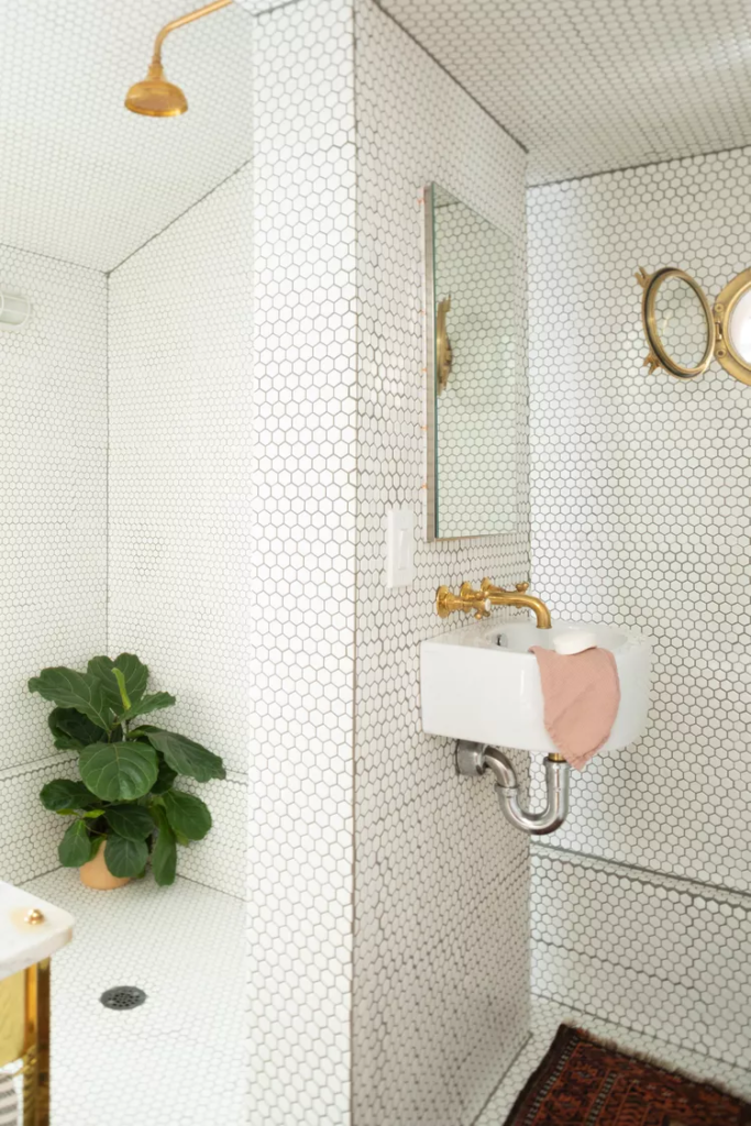 This tiny bathroom keeps proportion in mind with a small-scale white hexagon-shaped tile on the walls, ceiling, and floor. The light color and seamless continuity is a great trick to create the illusion of space and height, and creates a neutral backdrop for other decorative layers. A brass nautical window adds a whimsical touch, while a frameless mirror bounces light around and visually extends the space. A vintage-style rug replaces a traditional bath mat for a pop of unique style and color.