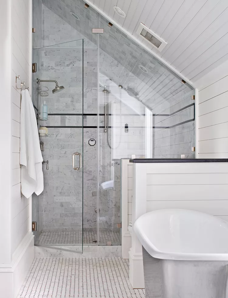You don’t have to stick with the same tile inside the shower. For example, use white subway tile to wainscot height, glass mosaic tile above that for an unexpected visual twist, and pebble tile on the floor for a gentle foot massage. Some of the best shower tile ideas use a variety of tile types to their fullest potential.