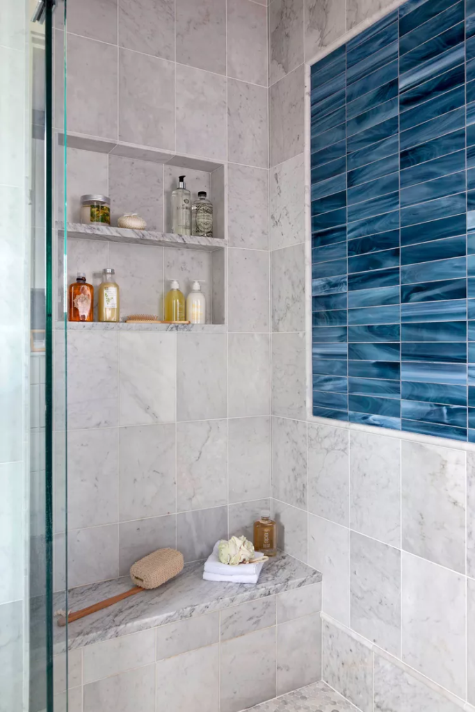 Small shower insets are a natural spot to show off shower tile ideas for different types or contrasting or complementary colors. For example, a wall of white subway tile can get a fun pop of color with a blue mosaic or encaustic tile inside a recessed shelf. Or, keep the tile the same color and type for a more subdued look.
