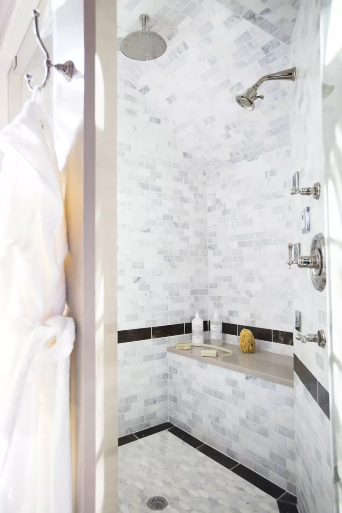 Shower tiles can stand as a great counterpoint to other tiles in the bathroom. For example, a slender black border in a shower is a great way to complement the black tiles on this floor. You can also match a backsplash on the bathroom vanity to the tile in your shower.