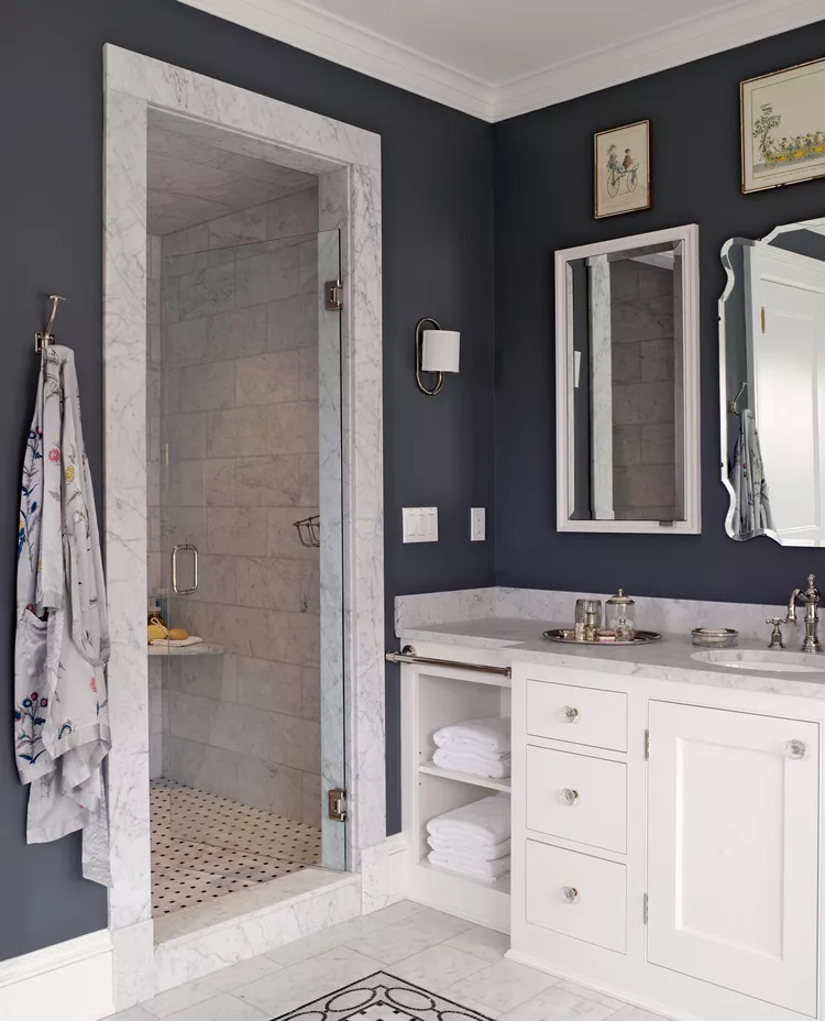 Outside the shower, some baths might not have a lot of tile. Bathroom shower tile patterns are a great opportunity to highlight other colors and materials throughout the room. Here, dark navy shower tiles accentuate medium-gray walls and bright white trim. Marble tile looks extra glam when paired with gold accents and light fixtures.
