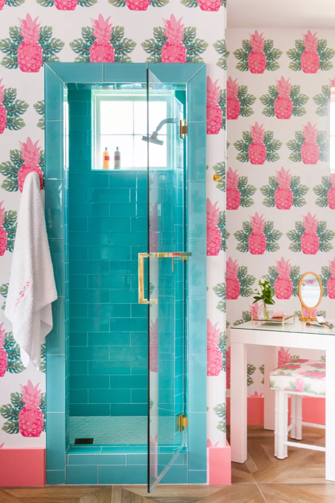 A retro-inspired turquoise shower tile gets a modern makeover in this colorful bathroom. If your home features a yellow, blue, or pink tiled bathroom that was all the rage in the 1950’s, instead of trying to ignore it, embrace it by creating a playful design. A whimsical hot pink pineapple wallpaper matches the blue shower in color intensity and matching baseboards add another bold statement. And to tone down all the color, hardwood floors arranged in a square pattern bring in warmth and a touch of sophistication.