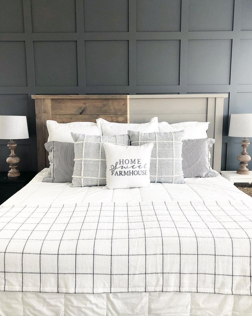 Sophisticated grey panelling serves as a striking backdrop, blending modern flair with classic farmhouse style. A rustic headboard adds warmth and charm, while plaid and striped pillows introduce layered textures. A central pillow featuring a charming message anchors the design, evoking a welcoming, homey atmosphere.