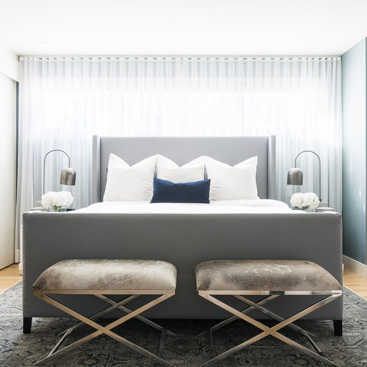 Sheer curtains gently diffuse daylight, providing a calming backdrop for the slate gray bed. Navy accent pillows add a bold touch of color, creating depth in the design. Sleek bedside lamps reflect the room’s clean lines, while fur-covered stools below offer a touch of luxurious comfort.