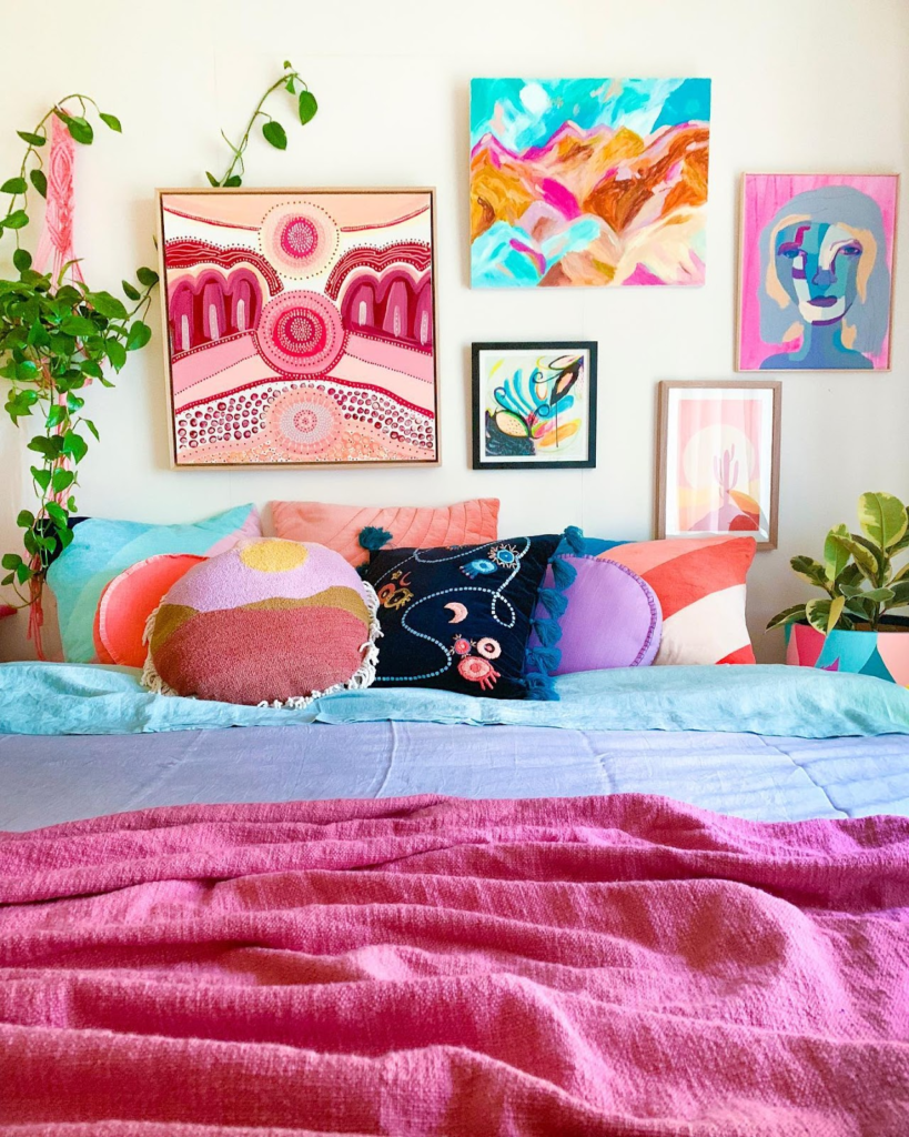 A vibrant gallery wall brimming with colorful artwork energizes the room, bringing creativity and life to the space. A variety of pillows add textural and visual diversity, while lush plants contribute a refreshing natural element. A richly hued pink blanket completes the artistic and spirited atmosphere.