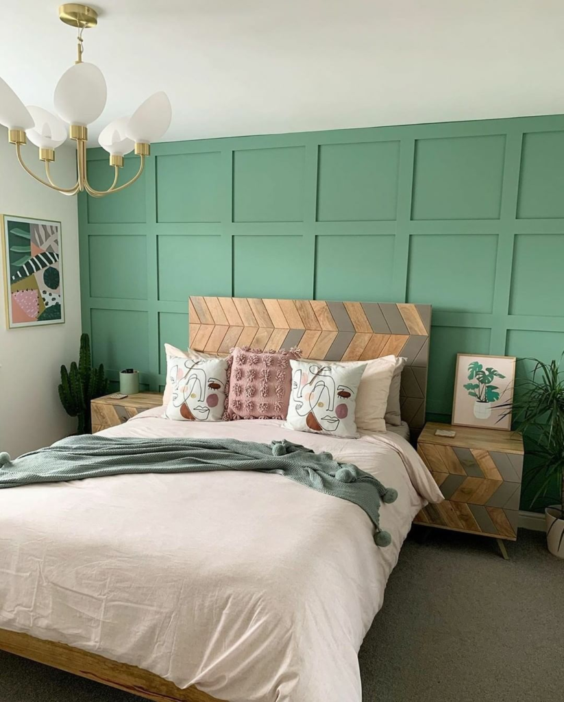A seafoam green panelled wall provides a refreshing and calming backdrop. An eclectic headboard with mixed wood tones introduces an artistic touch, complemented by cozy textiles and plush cushions in pink and white. A chic gold chandelier and abstract art pieces add a modern, elegant flair.